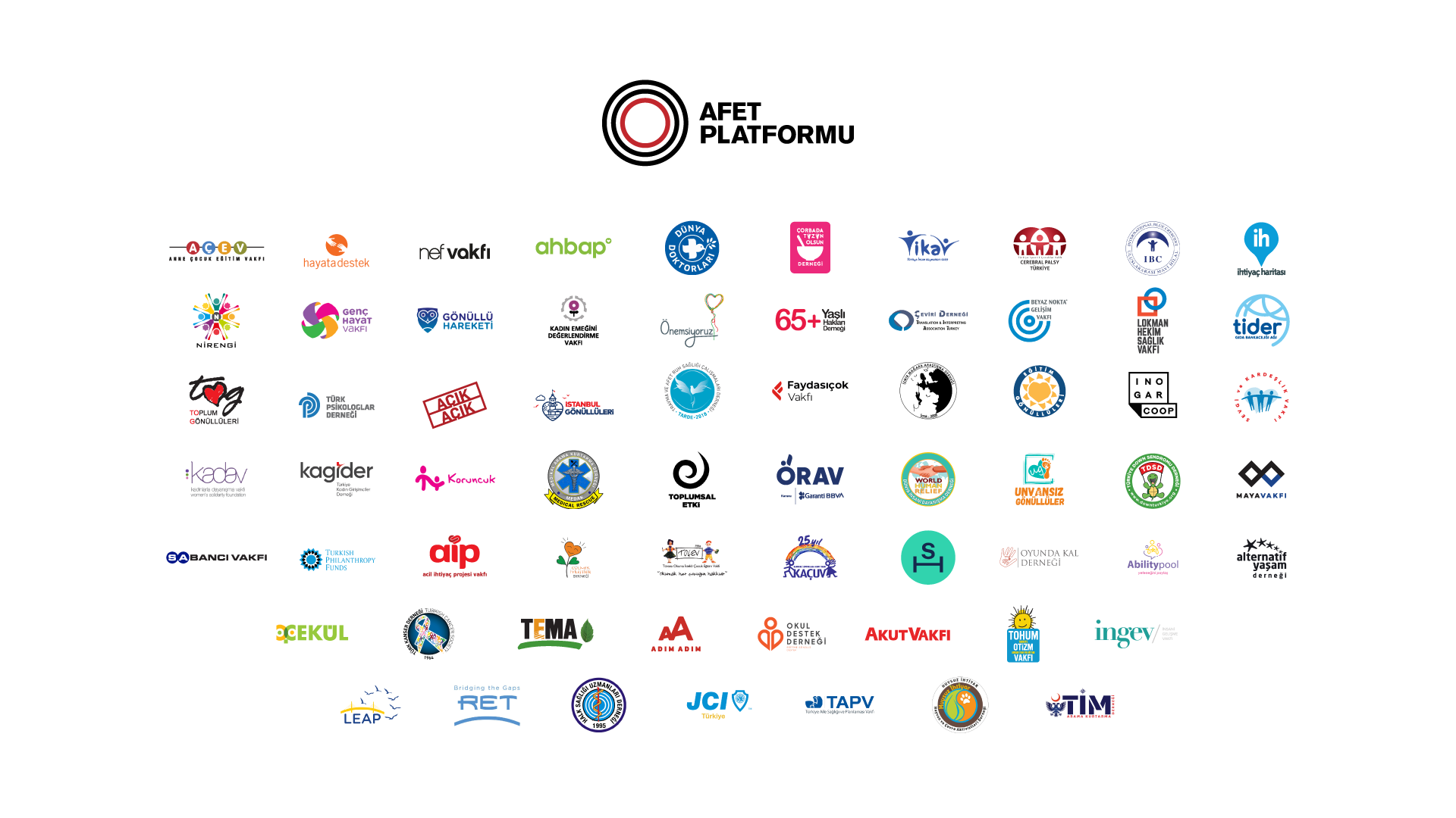 Afet Platformu kapsamında insani yardım, psikososyal destek, arama-kurtarma faaliyetleri gibi pek çok tematik alanda faaliyet yürüten kuruluşlar, bir araya gelerek afetlere etkin ve organize bir şekilde müdahale edebilmektedir.